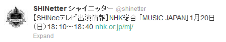 SHINee irá aparecer em um show musical japonês "NHK Music Japan" no dia 23 de janeiro de 2013 (domingo).A transmição vai ao ar das 6:10 até 6:40